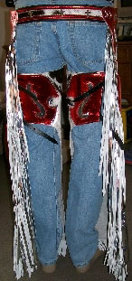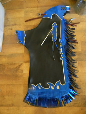 Drill Team Chaps: Base price 325.00 are made of 4.0oz to 4.5 oz top grain leather. Many colors to choose from, contrasting top and fringe. Metallic and bottom design extra, also tooled tops and leg and belt options.