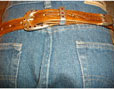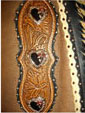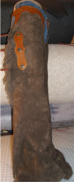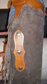 Cutting Chaps: Base price $375.00 depending on the conchos buckle loop and tip, are made of 4.5oz to 5.oz suede leather with tooled top belt and leg with choice of conchos. with 3 straps and buckles.