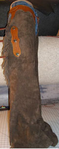 Brown shotgun chaps with double twisted fringe and Navajo trim with leg shield