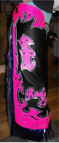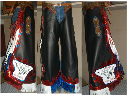 Rodeo Chaps: Bull riding, saddle bronc bareback: Base price 225.00 for base color and 1 color metallic leather fringe. No bottom design are made of 5.0 to 5.5 top grain leather in many base colors. 10 metallic colors. Bottom design and double fringe are add ons sponsor names can be be added.